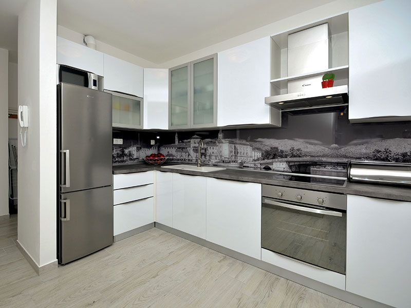 Kitchen is equipped with coffee machine, microwave, dishwasher, refrigerator, electric kettle, oven, stovetop, kitchenware, cleaning products.