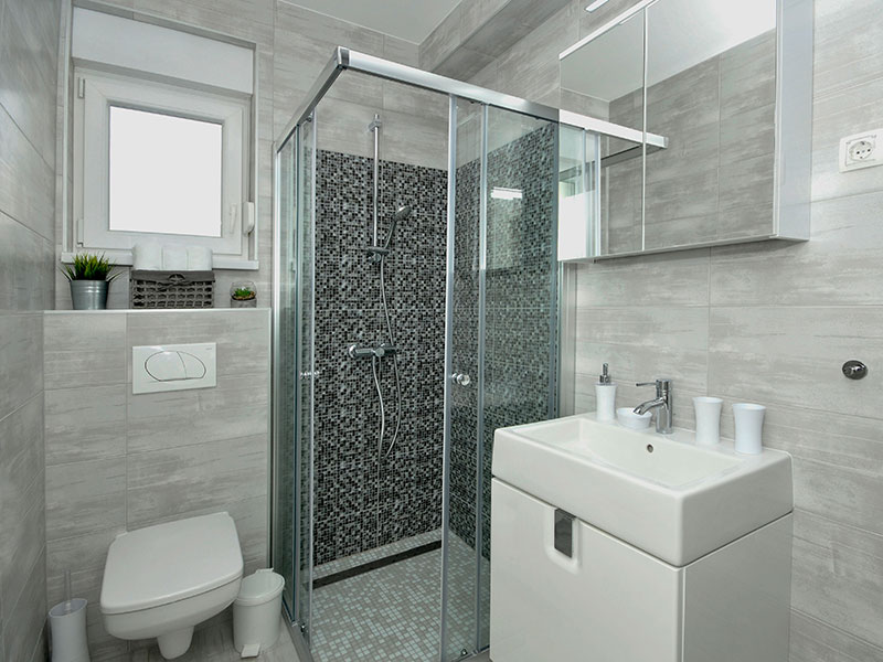 Bathroom with walk-in shower, hairdryer, washing machine, dryer, iron and ironing facilities, towels, toilet paper.